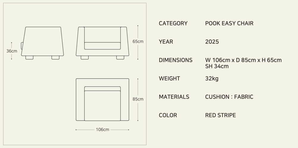 정돈된 실루엣과 균형 잡힌 비례가 패브릭의 매력을 더욱 돋보이게 하는 이지체어. 일반적인 1인용 이지체어보다 넉넉한 사이즈로 더욱 편안한 휴식을 제공한다.