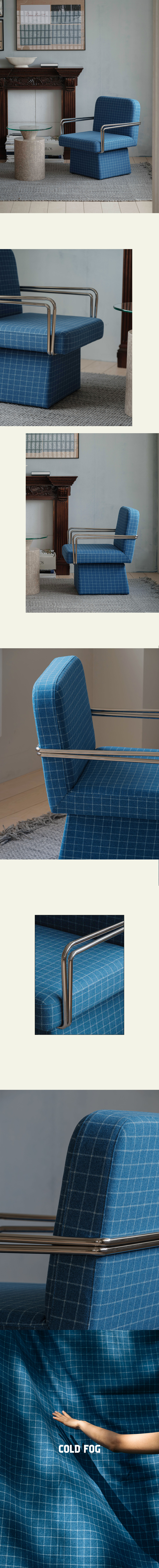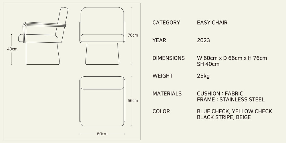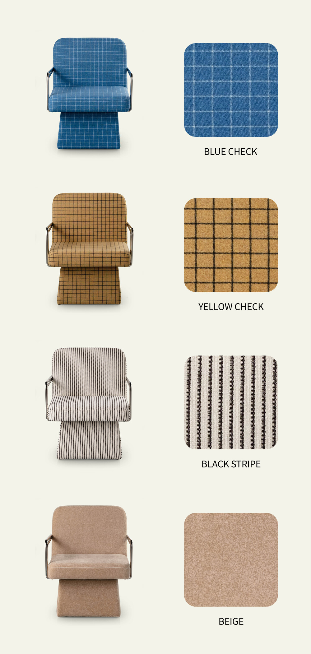 다양한 휴식 공간에 적합한 이지체어로 회전 기능이 있어 더욱 활용도 높게 사용할 수 있다. 두 개의 벤딩된 스틸 파이프가 포인트로 팔걸이 역할을 하며 공간에 하나의 오브제로, 편안한 자리를 제공해 준다.