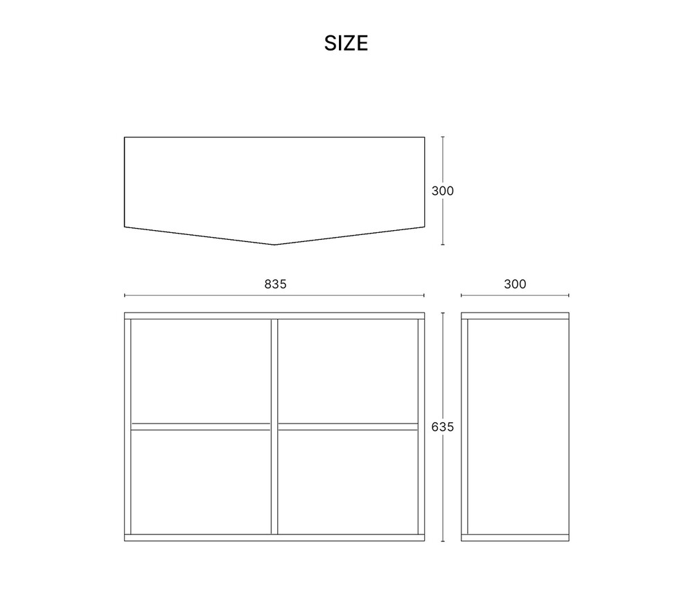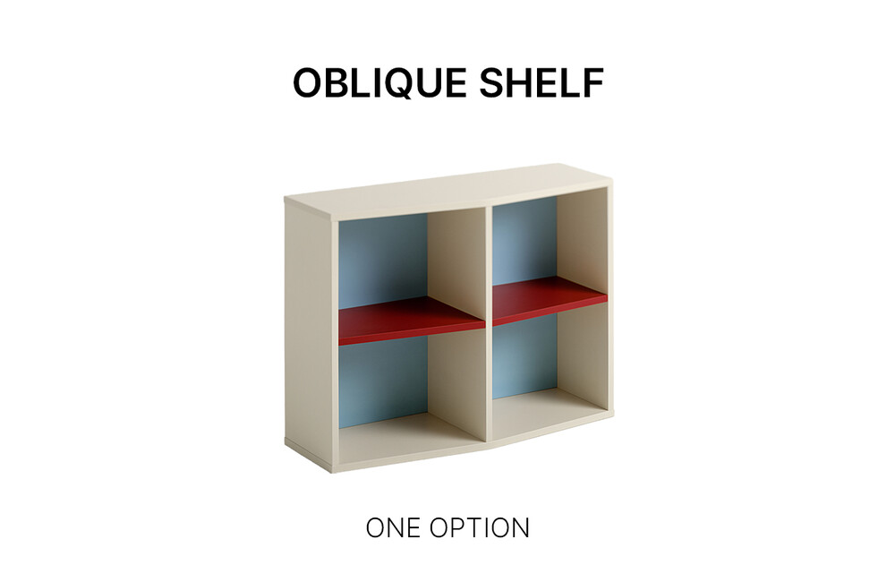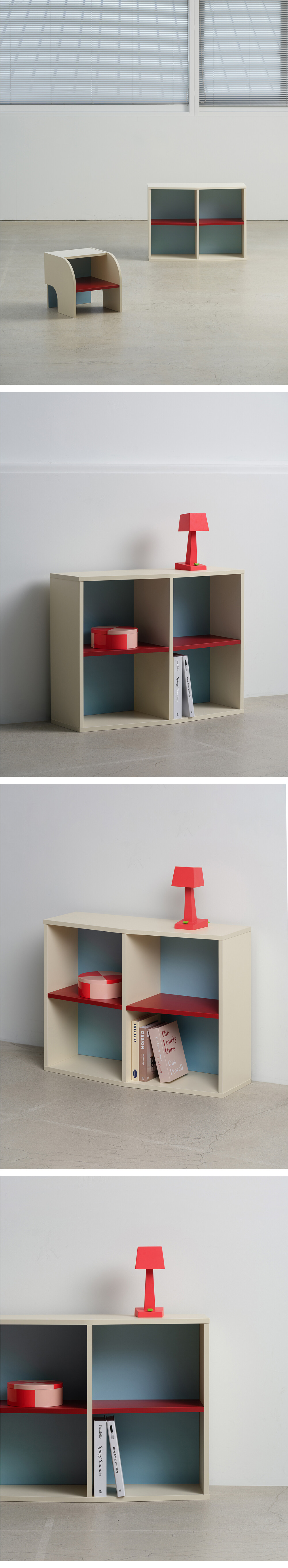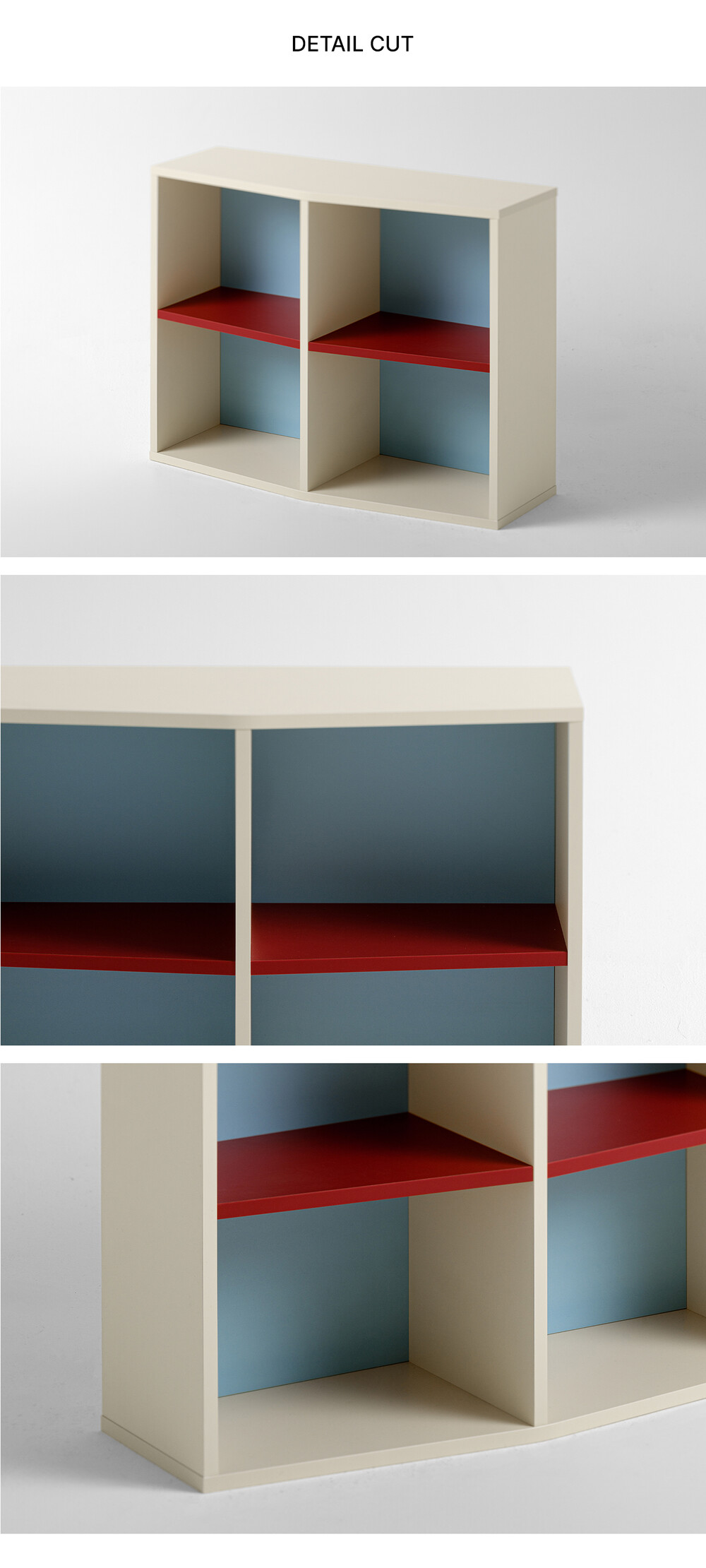 사각 큐브 형태로 어떤 공간에도 자연스럽게 어우러지며, 사선 컷팅 디테일과 스카이블루&버건디 컬러 조합이 공간에 재미를 더해준다. 같은 선반 여러개를 배치하여 더욱 실용적으로 사용할 수 있다.