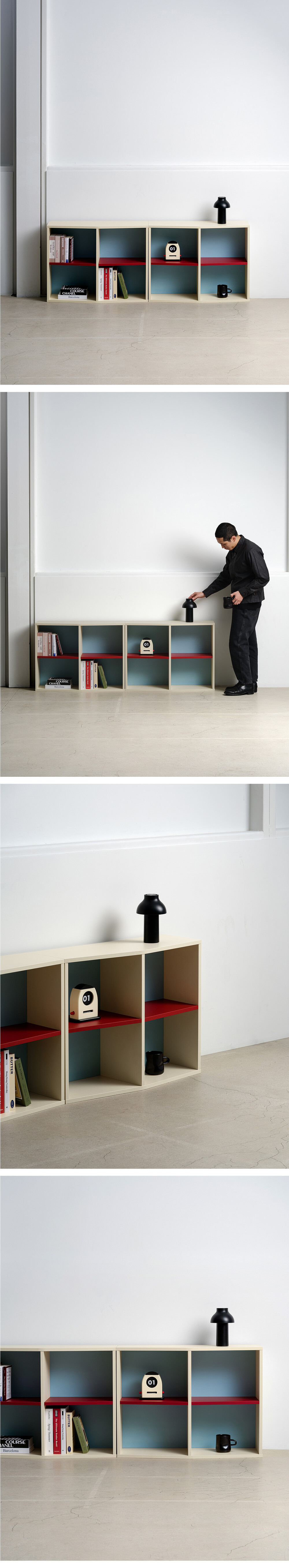 공간의 폭에 맞게 가로형, 세로형 두가지 방향으로 사용할 수 있는 선반.