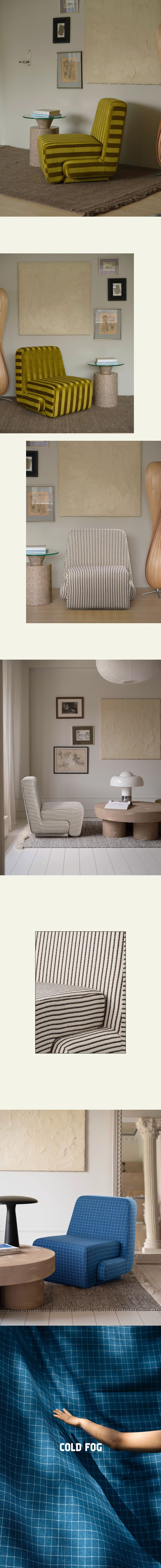 다양한 휴식 공간에 적합한 이지체어로 공간 속 존재감 있는 하나의 오브제 역할을 한다. 심플한 두 개의 매스가 조형적으로 조화를 이루고 있으며 편안한 착석감으로 휴식의 자리를 제공해 준다.